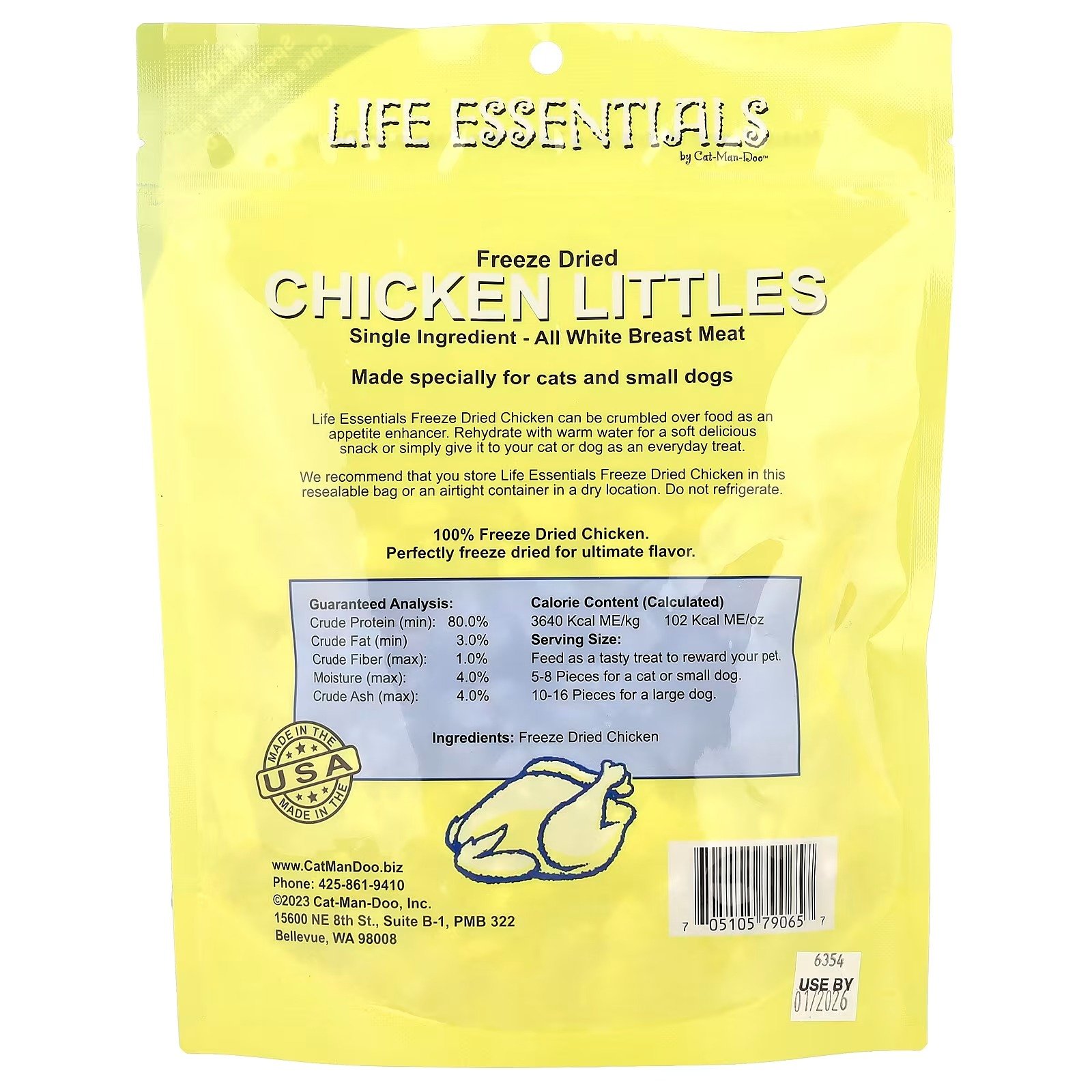 Esses Chicken Little são meticulosamente preparados com frango de carne branca 100% pura, garantindo uma guloseima de alta qualidade para seus amigos peludos. Elas são totalmente cozidas para eliminar quaisquer bactérias potenciais e, em seguida, liofilizadas até a perfeição, sem o uso de produtos químicos ou conservantes.